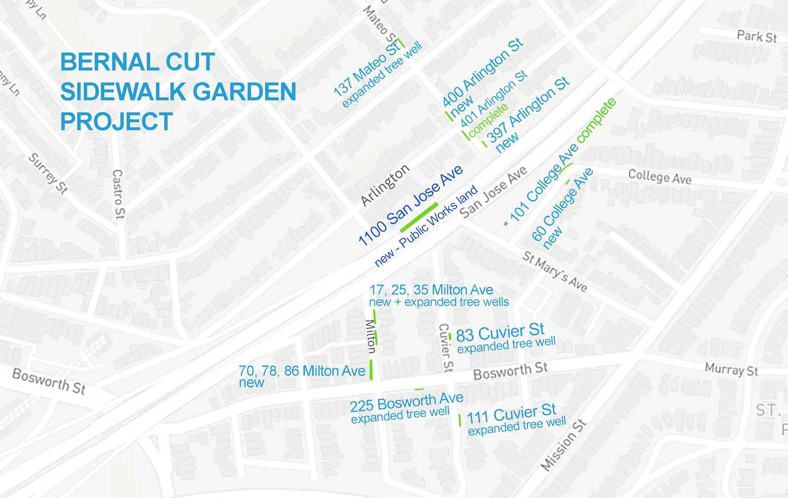 - Sidewalk Rain Gardens: Expand the existing network of sidewalk gardens along College Ave, St. Mary's Ave, Mateo, Miguel, and other corridor streets to capture stormwater from hillside runoff in the Islais Creek watershed